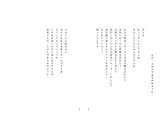 詩集は全編お祈りであり、神さまへの単純素朴な語りかけを通して、安らぎや希望を抱いていると語る著者。