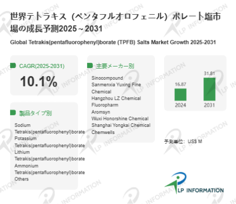 LP Information調査チームの最新レポートである「世界テトラキス(ペンタフルオロフェニル)ボレート塩市場の成長予測2025~2031 」(https://www.lpinformation.jp/reports/598401/tetrakis-pentafluorophenyl-borate--tpfb--salts)によると、2025~2031年のテトラキス(ペンタフルオロフェニル)ボレート塩市場はCAGR10.1%で拡大し、2031年には0.32億米ドルに到達すると予測される。この成長は、化学合成の高度化や特殊機能性材料の需要増加を反映するものである。医薬品、電子材料、触媒分野における高選択性・高安定性化学品への需要が増加しており、先進国・新興国双方でバランスよく成長している。市場規模は小さいものの、高付加価値かつ専門用途向けの製品として、持続的な成長を支える安定的な需要基盤を形成している。