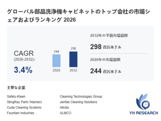 YHResearch調査チームの最新レポート「グローバル部品洗浄機キャビネットのトップ会社の市場シェアおよびランキング 2026」によると、2026年の244百万米ドルから2032年には298百万米ドルに成長し、2026年から2032年の間にCAGRは3.4%になると予測されています。