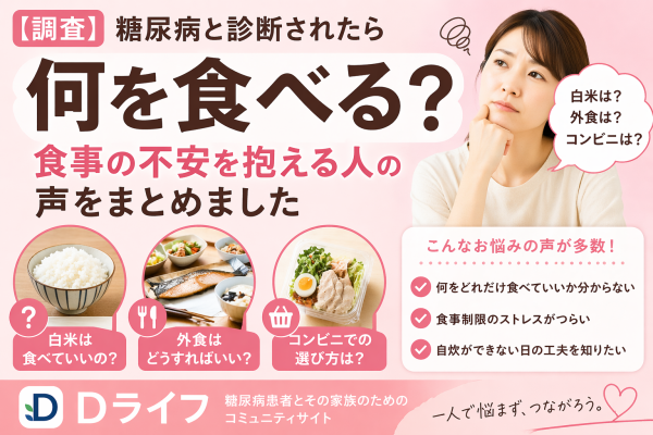 糖尿病患者とその家族のためのコミュニティサイト『Dライフ( https://diabeteslife.jp )』を運営する合同会社MYASIA Entertainmentは、このたび糖尿病診断後の食事に関する相談傾向と検索動向をもとに、ユーザーの声を整理した調査結果をまとめました。診断直後に「何を食べていいか分からない」と感じる方が多く、白米や外食、コンビニ食品への不安が特に強い傾向があることがわかってきました。