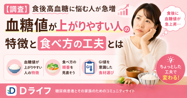 糖尿病患者とその家族のためのコミュニティサイト『Dライフ( https://diabeteslife.jp )』を運営する合同会社MYASIA Entertainmentは、このたび血糖値の上昇しやすい体質や食後高血糖に関する相談傾向と検索動向をもとに、ユーザーの声を整理した調査結果をまとめました。食事内容を見直しているにもかかわらず食後に血糖値が急上昇してしまうという悩みが増えており、食べ方の順番や食材の選び方への関心が高まっていることがわかってきました。