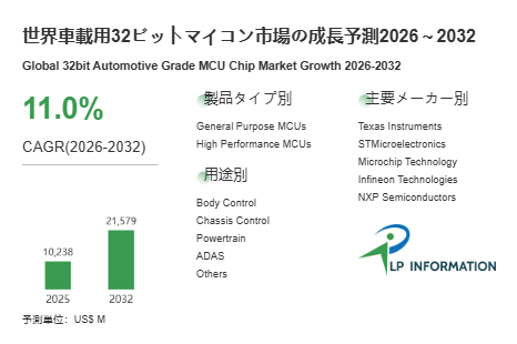 LP Information調査チームの最新レポートである「世界車載用32ビットマイコン市場の成長予測2026~2032 」(https://www.lpinformation.jp/reports/683429/32bit-automotive-grade-mcu-chip)によると、2026年から2032年の予測期間中のCAGRが11.0%で、2032年までにグローバル車載用32ビットマイコン市場規模は215.79億米ドルに達すると予測されている。成長の骨格は三つある。第一に電動化とADASの普及により、制御点数と演算量が増大し、より高性能で統合度の高いマイコンへの置換が進む点である。
