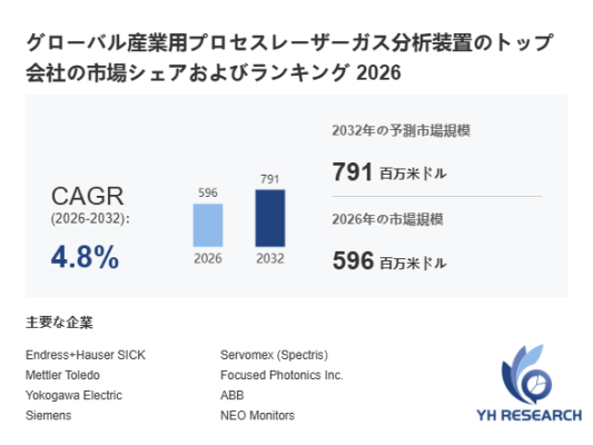 YHResearch調査チームの最新レポート「グローバル産業用プロセスレーザーガス分析装置のトップ会社の市場シェアおよびランキング 2026」によると、2026年の596百万米ドルから2032年には791百万米ドルに成長し、2026年から2032年の間にCAGRは4.8%になると予測されています。