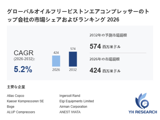 YHResearch調査チームの最新レポート「グローバルオイルフリーピストンエアコンプレッサーのトップ会社の市場シェアおよびランキング 2026」によると、2026年の424百万米ドルから2032年には574百万米ドルに成長し、2026年から2032年の間にCAGRは5.2%になると予測されています。