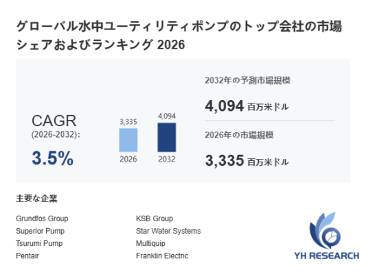 YHResearch調査チームの最新レポート「グローバル水中ユーティリティポンプのトップ会社の市場シェアおよびランキング 2026」によると、2026年の3335百万米ドルから2032年には4094百万米ドルに成長し、2026年から2032年の間にCAGRは3.5%になると予測されています。