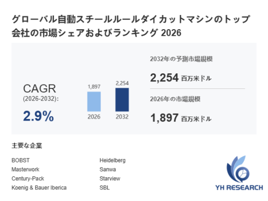 YHResearch調査チームの最新レポート「グローバル自動スチールルールダイカットマシンのトップ会社の市場シェアおよびランキング 2026」によると、2026年の1897百万米ドルから2032年には2254百万米ドルに成長し、2026年から2032年の間にCAGRは2.9%になると予測されています。