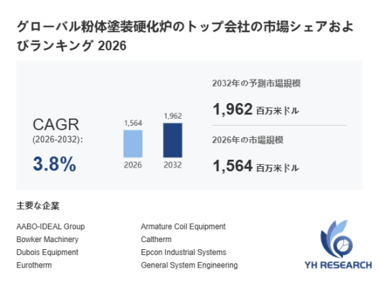 YHResearch調査チームの最新レポート「グローバル粉体塗装硬化炉のトップ会社の市場シェアおよびランキング 2026」によると、2026年の1564百万米ドルから2032年には1962百万米ドルに成長し、2026年から2032年の間にCAGRは3.8%になると予測されています。