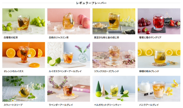 掲載画像のレギュラーフレーバーはラインナップの一部であり、このほか季節限定ティーなど豊富に取り揃えています。