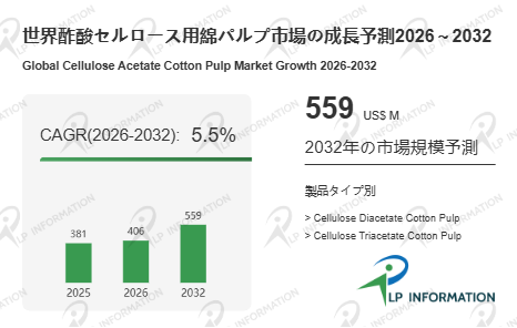LP Information調査チームの最新レポートである「世界酢酸セルロース用綿パルプ市場の成長予測2026~2032 」(https://www.lpinformation.jp/reports/601198/cellulose-acetate-cotton-pulp)によると、2026年から2032年の予測期間中のCAGRが5.5%で、2032年までにグローバル酢酸セルロース用綿パルプ市場規模は5.59億米ドルに達すると予測されている。すなわち前半は安定成長、後半は成長率が一段高まる構図である。