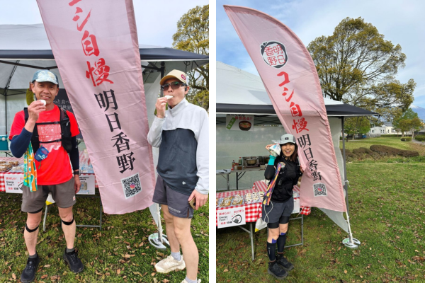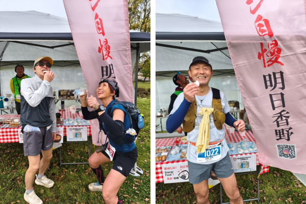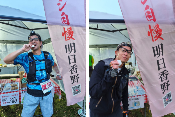 明日香野は、エイドステーションにて「塩あんこ餅」「わらび餅」をランナーにお渡し。長時間にわたって走り続ける選手のエネルギー補給に役立てていただきました。