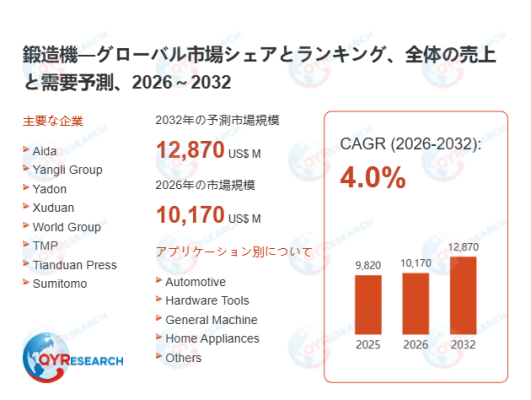 本記事は、QY Research発行のレポート「鍛造機―グローバル市場シェアとランキング、全体の売上と需要予測、2026~2032」に基づき、市場動向および競合分析の概要を解説します。
