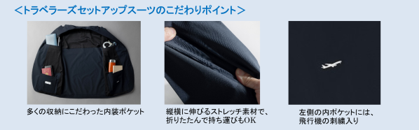 機能的かつ洗練されたデザインで人気のABAHOUSEとANAのコラボレーションシリーズ『ABAHOUSE for ANA』に、トラベラーズセットアップスーツが登場です。トラベラーズセットアップスーツは型から制作した完全オリジナル商品で、移動の多いビジネスパーソンのニーズを隅々まで反映しました。高いストレッチ素材を採用し、長時間のフライトや新幹線移動でもストレスフリーな着心地を実現。また、内装ポケットを装備し、スマートフォン、パスポート、カードケースなどをスマートに収納、バッグなしで軽快な移動をサポートします。フォーマルなスーツスタイルから、Tシャツを合わせたカジュアルアップまで、自由自在にスタイリングが楽しめます。ご家庭の洗濯機で水洗いでき、厳しい夏の暑さでも快適に着ることができます。