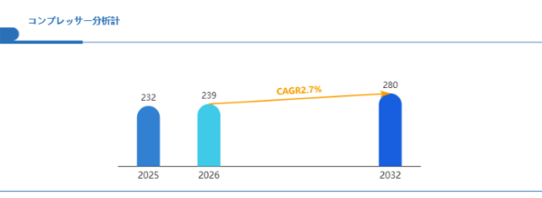 Global Reports調査チームの最新レポート「グローバルコンプレッサー分析計市場規模、主要企業シェア、ランキング分析レポート【2026年版】」によると、2026年の239百万米ドルから2032年には280百万米ドルに成長し、2026年から2032年の間にCAGRは2.7%になると予測されています。