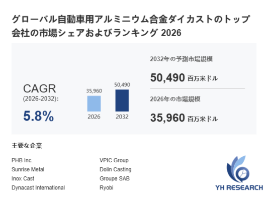 YHResearch調査チームの最新レポート「グローバル自動車用アルミニウム合金ダイカストのトップ会社の市場シェアおよびランキング 2026」によると、2026年の35960百万米ドルから2032年には50490百万米ドルに成長し、2026年から2032年の間にCAGRは5.8%になると予測されています。