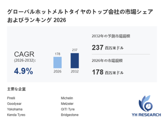 YHResearch調査チームの最新レポート「グローバルホットメルトタイヤのトップ会社の市場シェアおよびランキング 2026」によると、2026年の178百万米ドルから2032年には237百万米ドルに成長し、2026年から2032年の間にCAGRは4.9%になると予測されています。