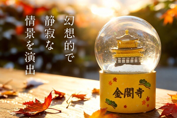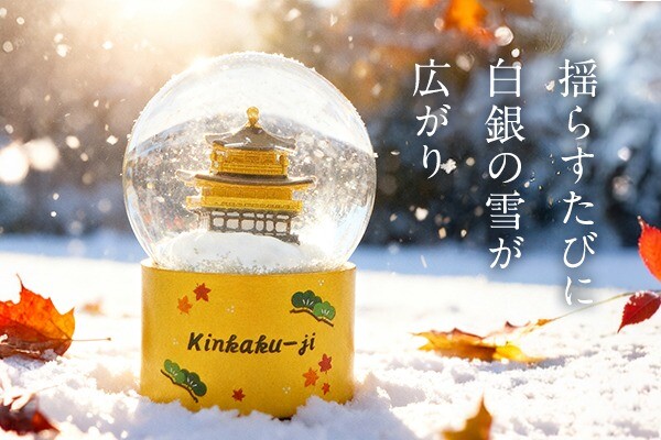 ドームを軽く振ることで、繊細な雪が舞い、金閣寺が雪化粧をまとったかのような神秘的な風景が広がります。