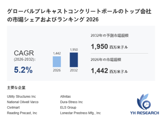 YHResearch調査チームの最新レポート「グローバルプレキャストコンクリートポールのトップ会社の市場シェアおよびランキング 2026」によると、2026年の1442百万米ドルから2032年には1950百万米ドルに成長し、2026年から2032年の間にCAGRは5.2%になると予測されています。