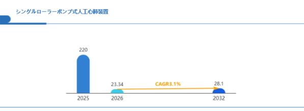 Global Reports調査チームの最新レポート「グローバルシングルローラーポンプ式人工心肺装置市場規模、主要企業シェア、ランキング分析レポート【2026年版】」によると、2026年の23.34百万米ドルから2032年には28.1百万米ドルに成長し、2026年から2032年の間にCAGRは3.1%になると予測されています。