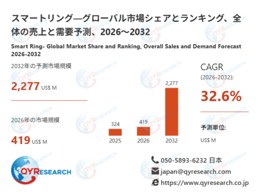 QYResearch調査チームの最新レポート「スマートリング―グローバル市場シェアとランキング、全体の売上と需要予測、2026~2032」によると、スマートリングの世界市場は、2025年に324百万米ドルと推定され、2026年には419百万米ドルに達すると予測されています。その後、2026年から2032年にかけて年平均成長率(CAGR)32.6%で推移し、2032年には2277百万米ドルに拡大すると見込まれています。