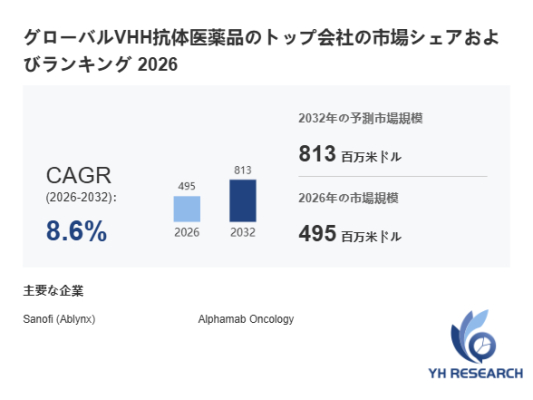 YHResearch調査チームの最新レポート「グローバルVHH抗体医薬品のトップ会社の市場シェアおよびランキング 2026」によると、2026年の495百万米ドルから2032年には813百万米ドルに成長し、2026年から2032年の間にCAGRは8.6%になると予測されています。