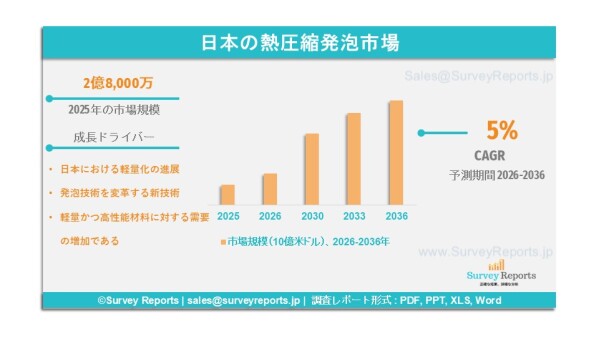 Surveyreportsの専門家による分析によれば、日本の熱圧縮発泡市場規模は2025年に2億8000万米ドルであったとされる。さらに、2036年末までに約4億米ドルに達する収益が見込まれている。日本の熱圧縮発泡市場は、2026年から2036年の予測期間において、約5%の年平均成長率(CAGR)で成長すると提案されているのである。