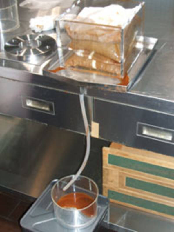 続いては、蒸した大豆と炒った小麦と麹菌を混ぜてできる“しょうゆ麹”を見学。これに食塩水を加えると“もろみ”になり、それを半年間熟成させたものを布に入れる。