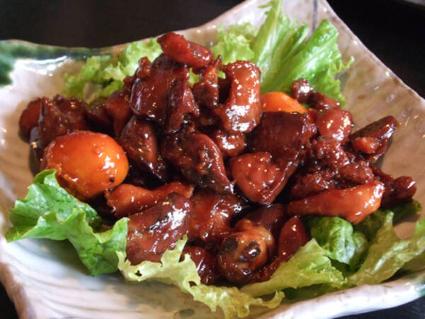 甲府鳥もつ煮とは、砂肝・レバー・ハツ・キンカン(生まれる前の卵)を醤油と砂糖で甘辛く煮たもの。