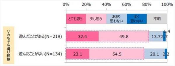 “リカちゃん遊び”を経験した子は経験していない子に比べて「自分の将来は明るいと思う」割合が高かったそうなんです。図を参照し比較すると、経験した子の「(自分の将来は明るいと)とても思う」回答は32.4%、「少し思う」回答は49.8%(計82.2%)。一方経験してない子の「とても思う」回答は23.1%で「少し思う」回答が54.5%(計77.6%)。