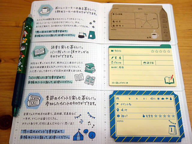 暮らしのキロクは全12種類のノリ付きメモ(付箋)です。「COFFEE」、「BOOK」、「EVENT」など、それぞれのテーマに合わせて作られた用紙を埋めていき、手帳やノートに貼るとジャンルを記録できるというもの。