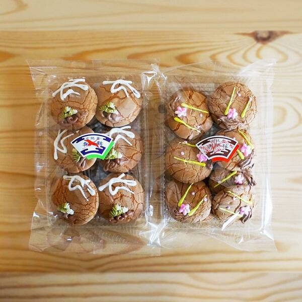 迎春気分を盛り上げてくれる、表面の鶴や松といったおめでたいモチーフは、なんと昇さんが奥様の正子(まさこ)さんとともにひとつずつ手描きしているそう! 限りなく手づくりに近いお菓子なのである。
