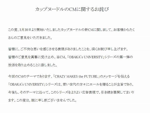 日清食品「カップヌードル」のテレビCM「OBAKA's大学に春が来た!」編の放送中止が2016年4月8日、発表された。カップヌードルの公式サイトに「カップヌードルのCMに関するお詫び」として、以下の文章が掲載されている。