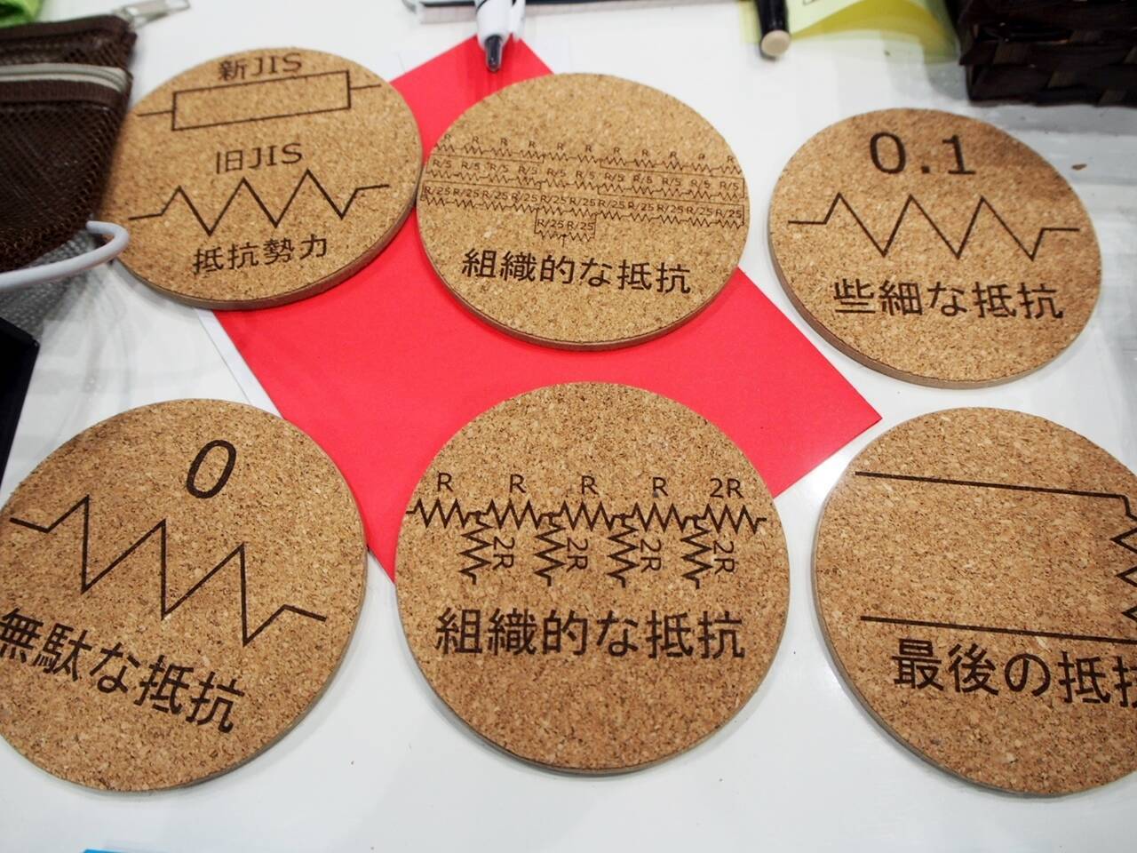 コルクのコースターに描かれた、抵抗器の図記号と「無駄な抵抗」、「抵抗勢力」などの文字。電子機器好きにはたまらない!?
