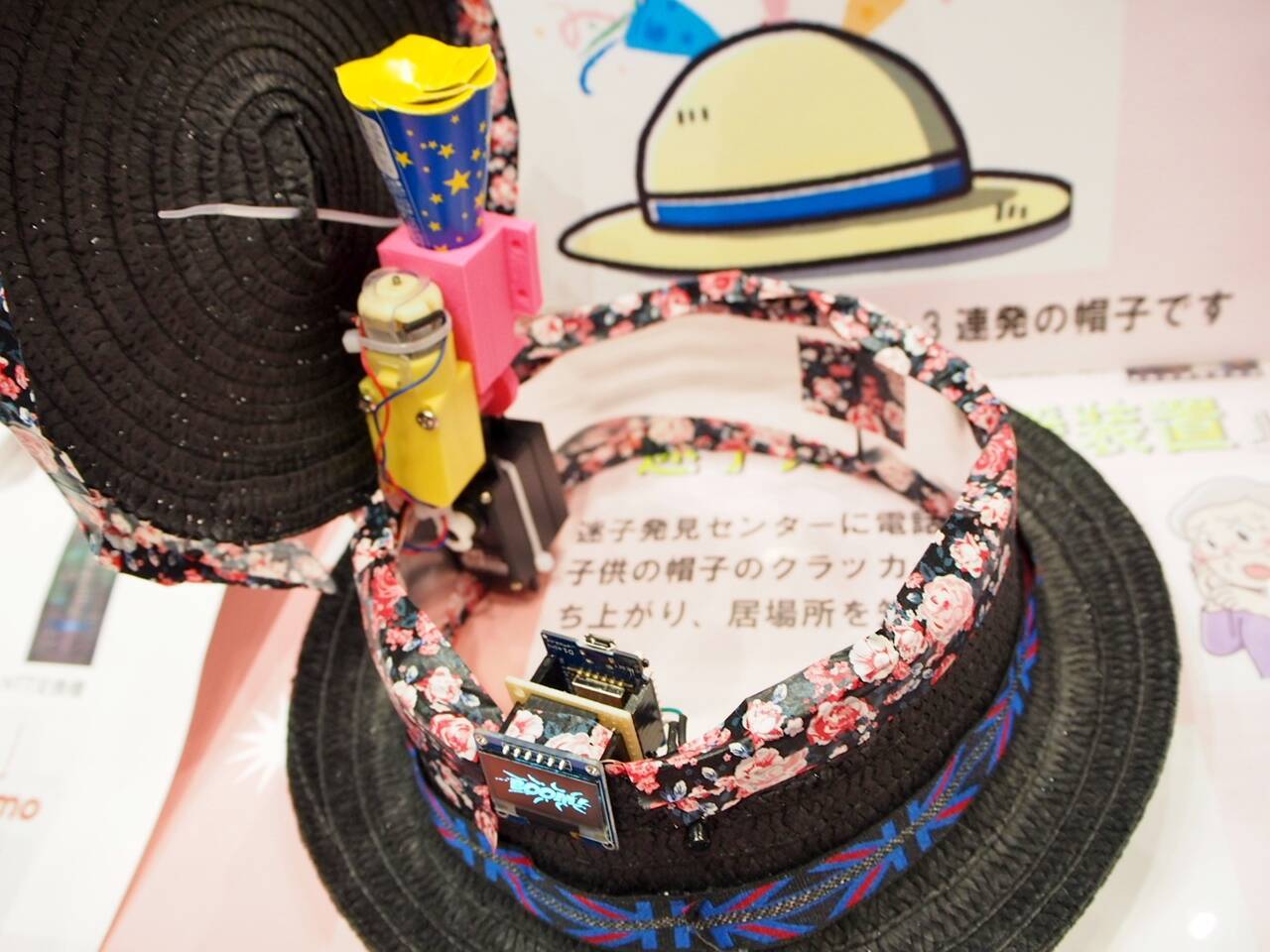 迷子発見センターに電話をかけると、子どもの帽子からクラッカーが自動で打ちあがり、居場所を知らせてくれます。