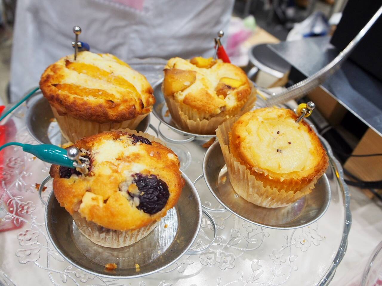 お菓子で電子回路をつくるユニット「BreadBoard Baking」の作品。カップケーキに電極が刺さっています。フォークで叩いてみると、たしかにドラム音が鳴りました。思わず食べたくなるカワイさ。でも残念ながら試食は不可でした。