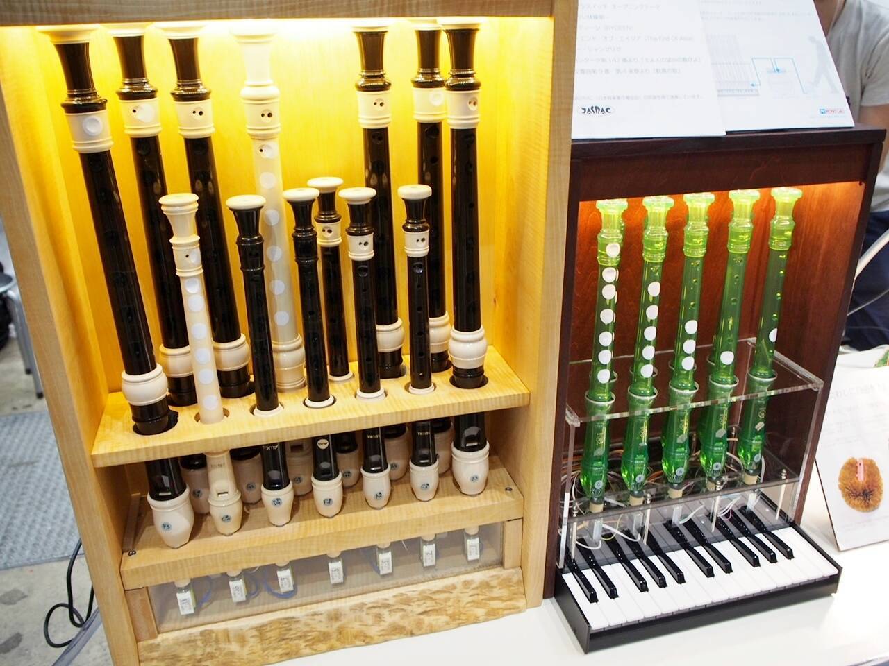 リコーダー(たて笛)を音源とする、かわいいパイプオルガンです。ポンプからの空気と電子制御により演奏。リコーダーの穴をふさぐことで音階を設定しているようです。