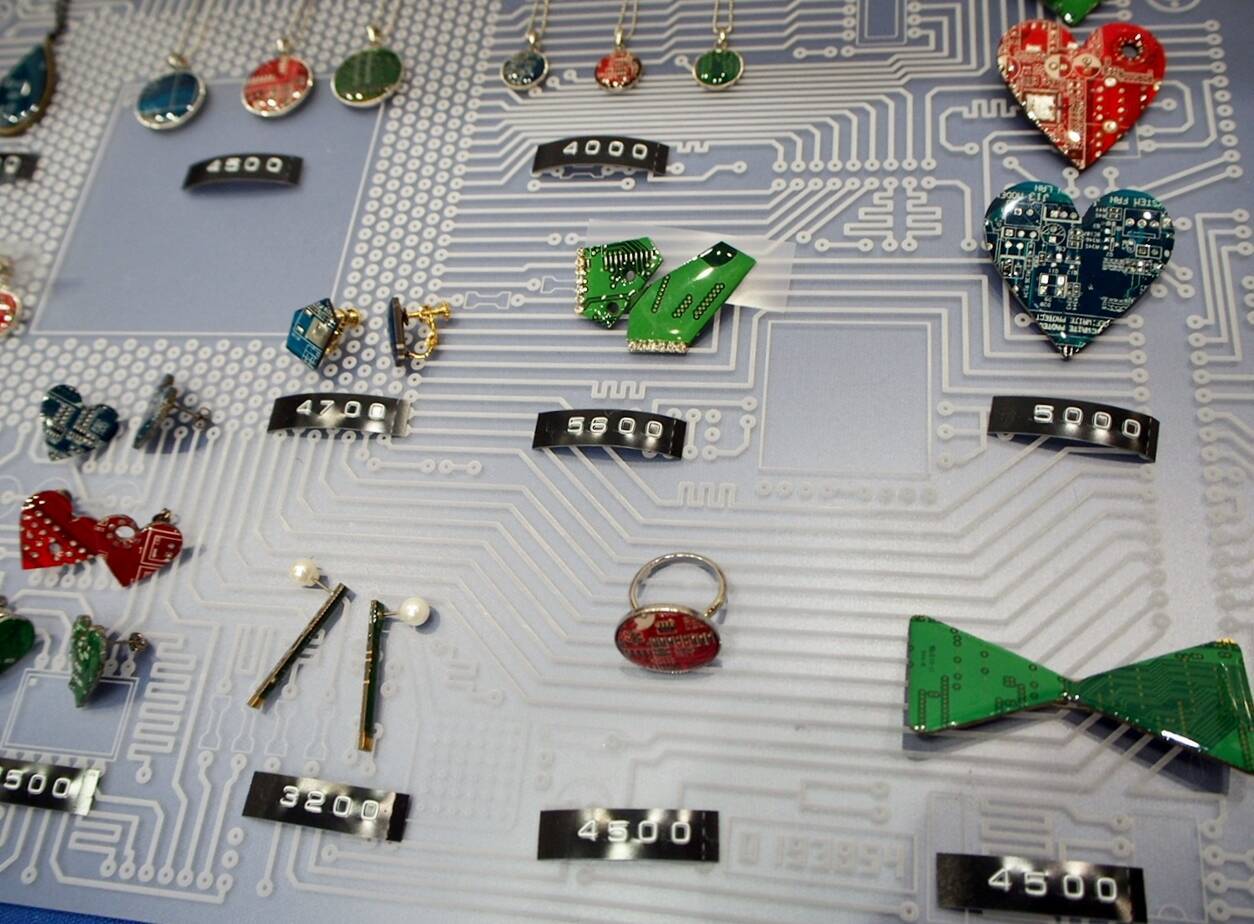 基板などの電子部品をアクセサリーにした作品。ハートやリボンの形もあり、意外とかわいいです。