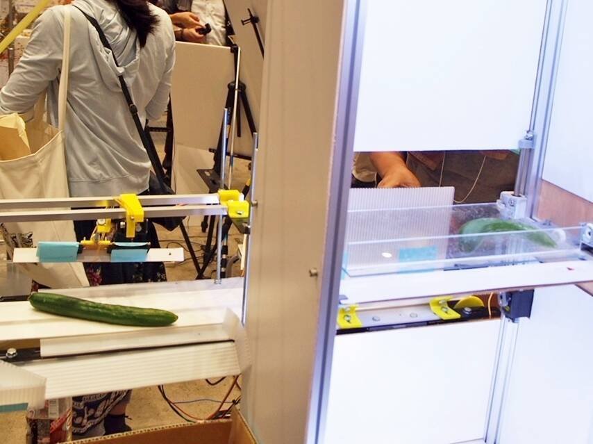 キュウリのサイズ・曲がり具合・傷の有無・色つやなどの判断を、人工知能にやらせてみるプロジェクト。キュウリを乗せるとカメラで撮影、等級の判断をおこない、それぞれの場所へ分別します。作ったのはキュウリ農家さん。
