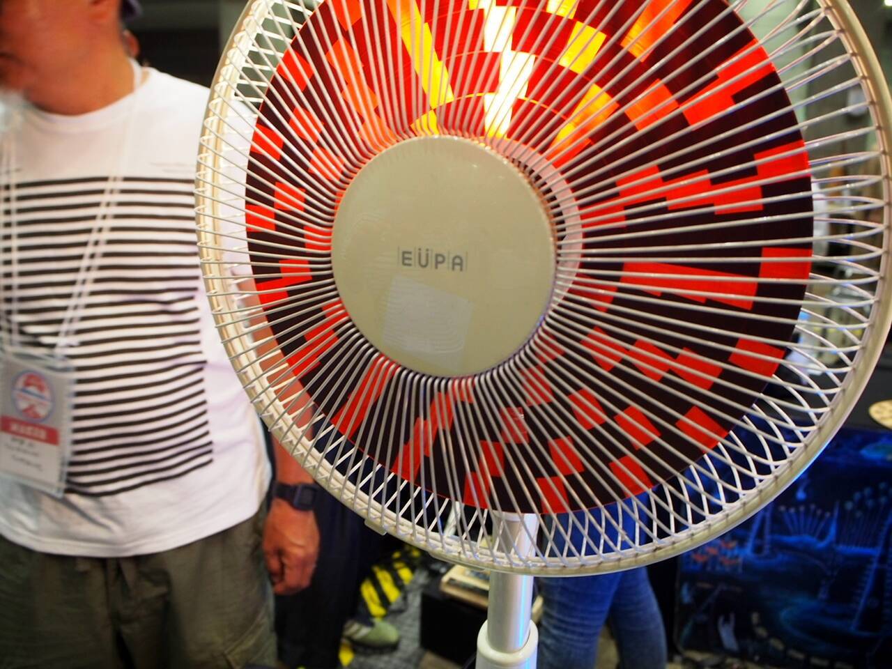 役割を終えた家電を、楽器としてよみがえらせる活動を行っている「エレクトロニコス・ファンタスティコス!」の作品。扇風機に光源とオリジナルの円盤を装着し、回転によって起こる光のチカチカを電気的な波(=音)に変えて演奏します。