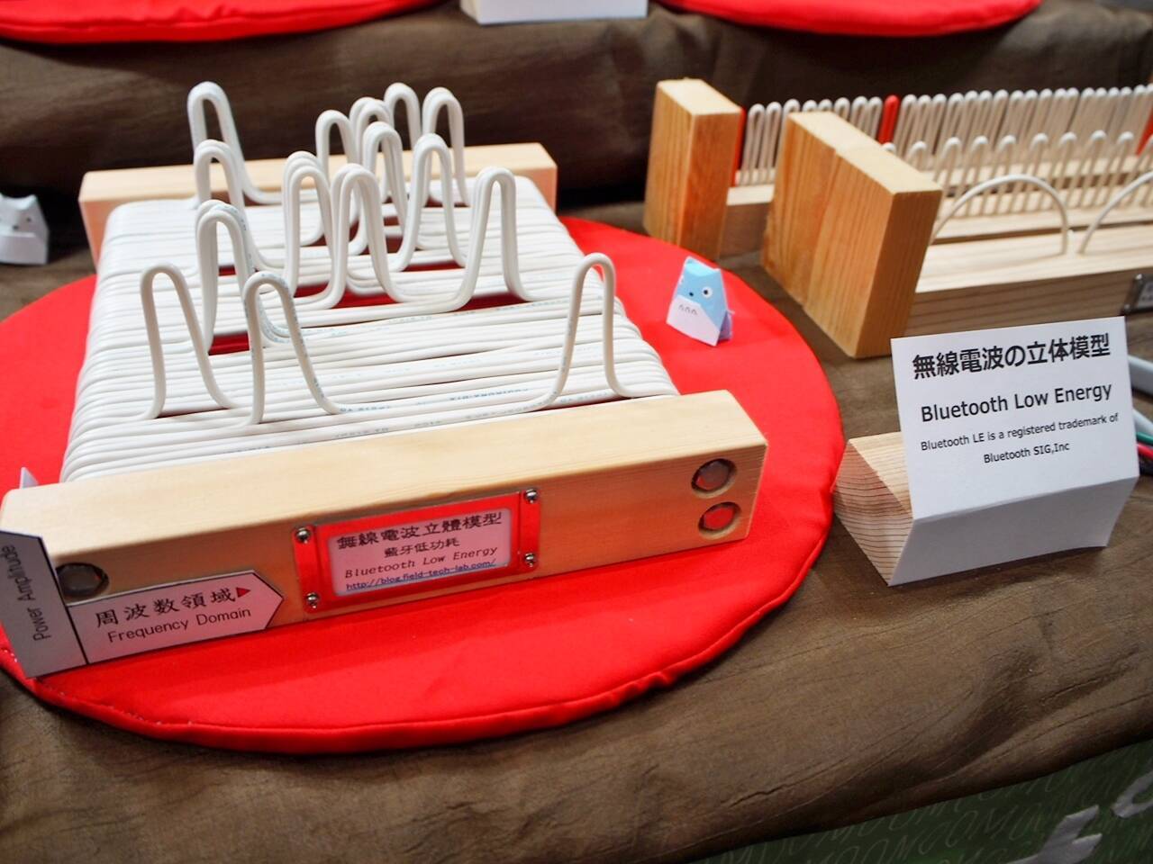 目で見ることができない無線電波を可視化した、手づくり立体模型。屋内配線用ビニル絶縁電線を使用し、ひとつひとつ手で折り曲げて周波数スペクトラムを組み上げています。発想はバカっぽいけど、アート作品ですねコレは。