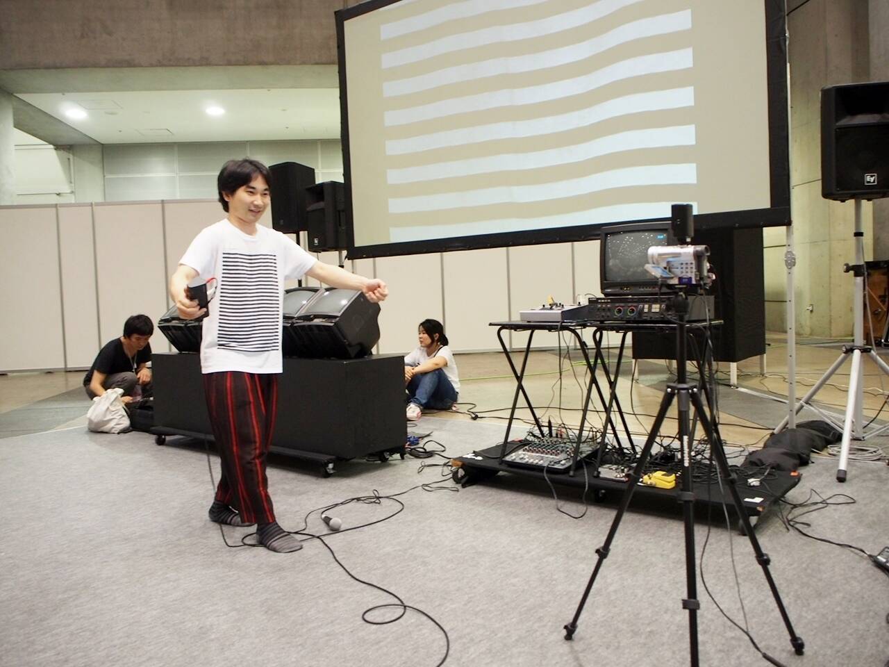 会場の一角にはステージがあり、プレゼンやパフォーマンスが行われていました。初日の最後は、和田永さんによる「ブラウン管ガムラン」と「ボーダーシャツァイザー」の演奏。観客も巻き込んだパフォーマンスに大きな拍手が起こっていました。