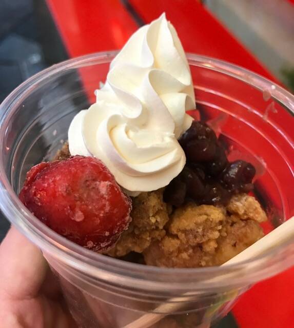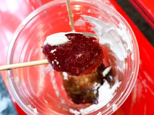 おいしそうなから揚げの上に、こんもりとつぶあんとクリームが。そしてワンポイントのアイス苺。早速食べてみます。