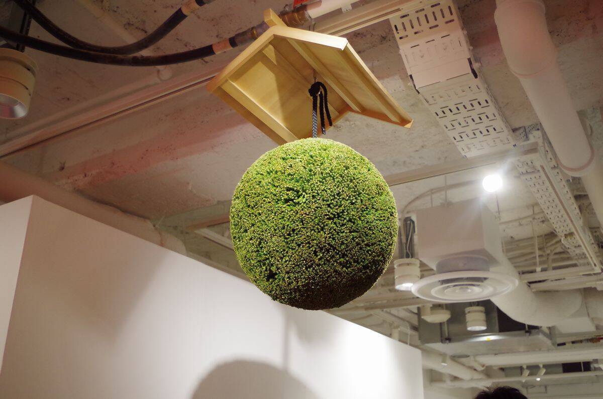 これは「杉玉」と呼ばれるもので、新酒ができたことを知らせるために吊るすものだそう。今回の展示会場内にも吊るされていました。