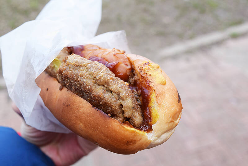 ほうばってみるとまず驚くのはパリッとしたパンの心地よい食感。そしてハンバーグの、鬼の、いや仏のような柔らかさ。ふわっとして肉汁があふれてくる。そしてウインナーのパリッと感とキャベツのジャキッと感。
