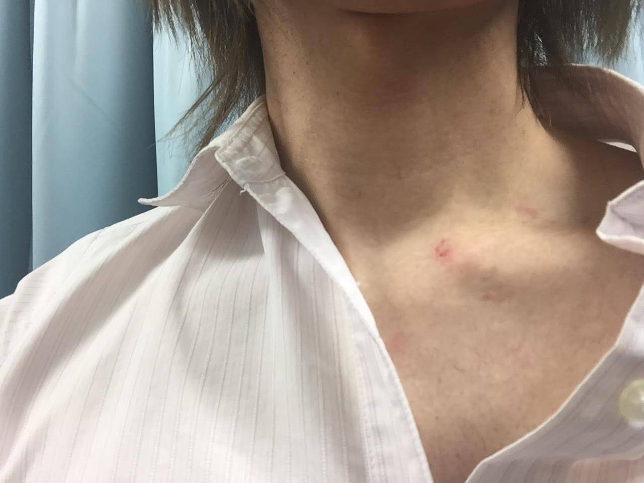 コラムニストの勝部元気さんが、駅で女性を盗撮していた中年男を注意したところ、顎を殴られ首を絞められる被害にあったとTwitterで明かした。ツイートとともにアップした首元の写真には、痛ましい赤い跡が残っている。