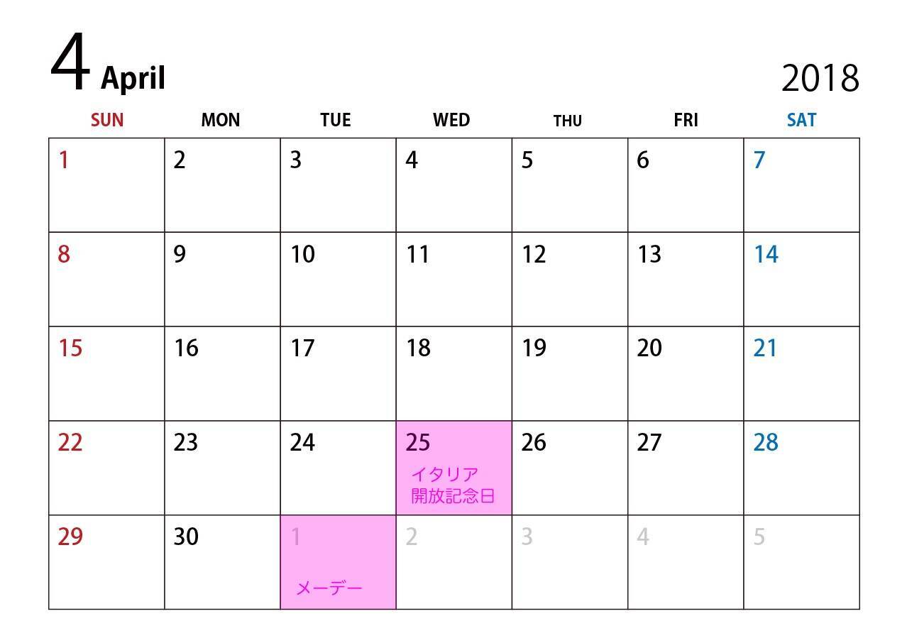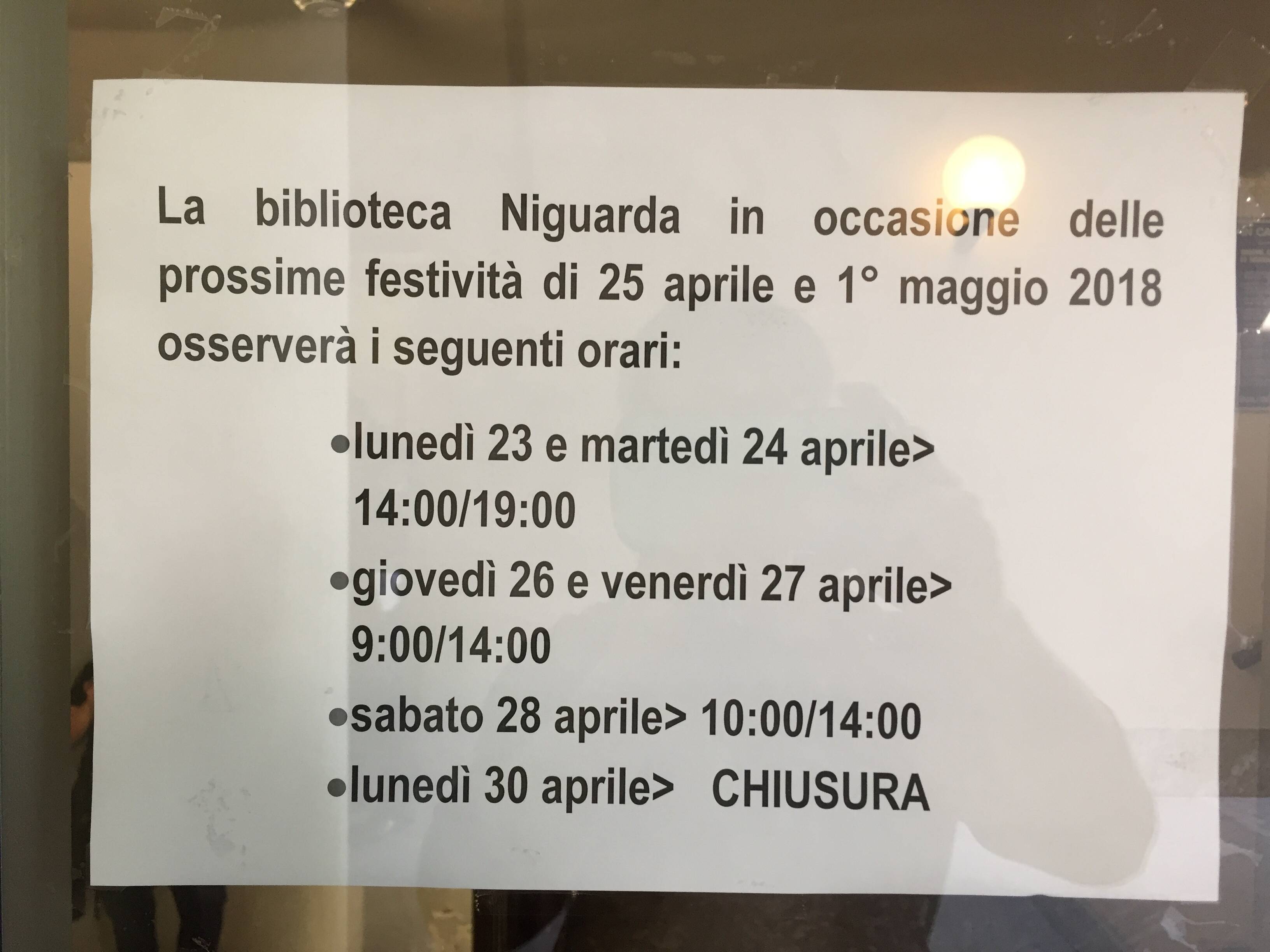 2018年4月〜5月初旬にかけてのカレンダーで、イタリアでは4月25日と5月1日はそれぞれ祝日にあたる。これに対して、ミラノ市内のとある図書館が出した休館日の予定が以下の画像である。