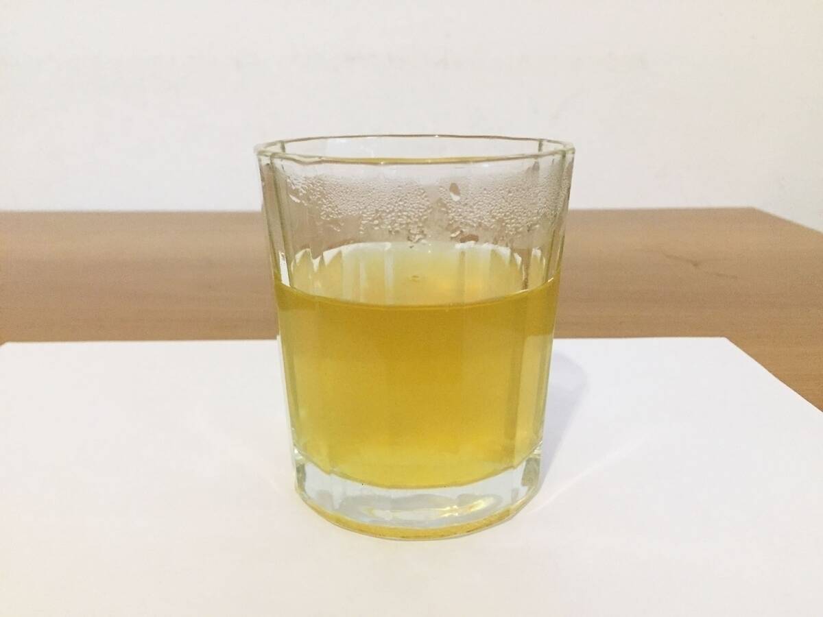 中身はティーバッグだったので、パッケージに書いてあるとおり100度のお湯を注いで2〜3分待ってみたのがこちら。色はともかく、香りは完全にレモンティーだ。実際に飲んでみると、紅茶のレモンティーに比べて味がぼんやりして物足りない感じ。これは紅茶に比べると緑茶のほうが味がデリケートなせいもあるかもしれない。