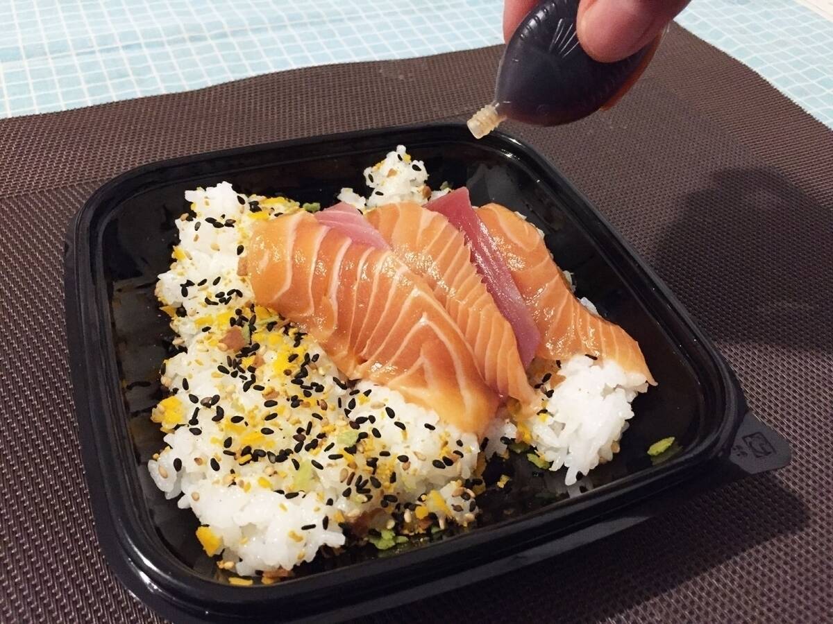 予想はつくと思うけど、ご飯にかかっているのりたまのようなものはカレー味のフレークだ。どうしてこんなことになったのかは分からないが、実はカレーフレークの風味がそれほど強くないため、思ったほど刺身とケンカしていない。ちらし寿司にほのかにスパイスが混じっているだけで、不思議なことに味は意外とまとまっている。
