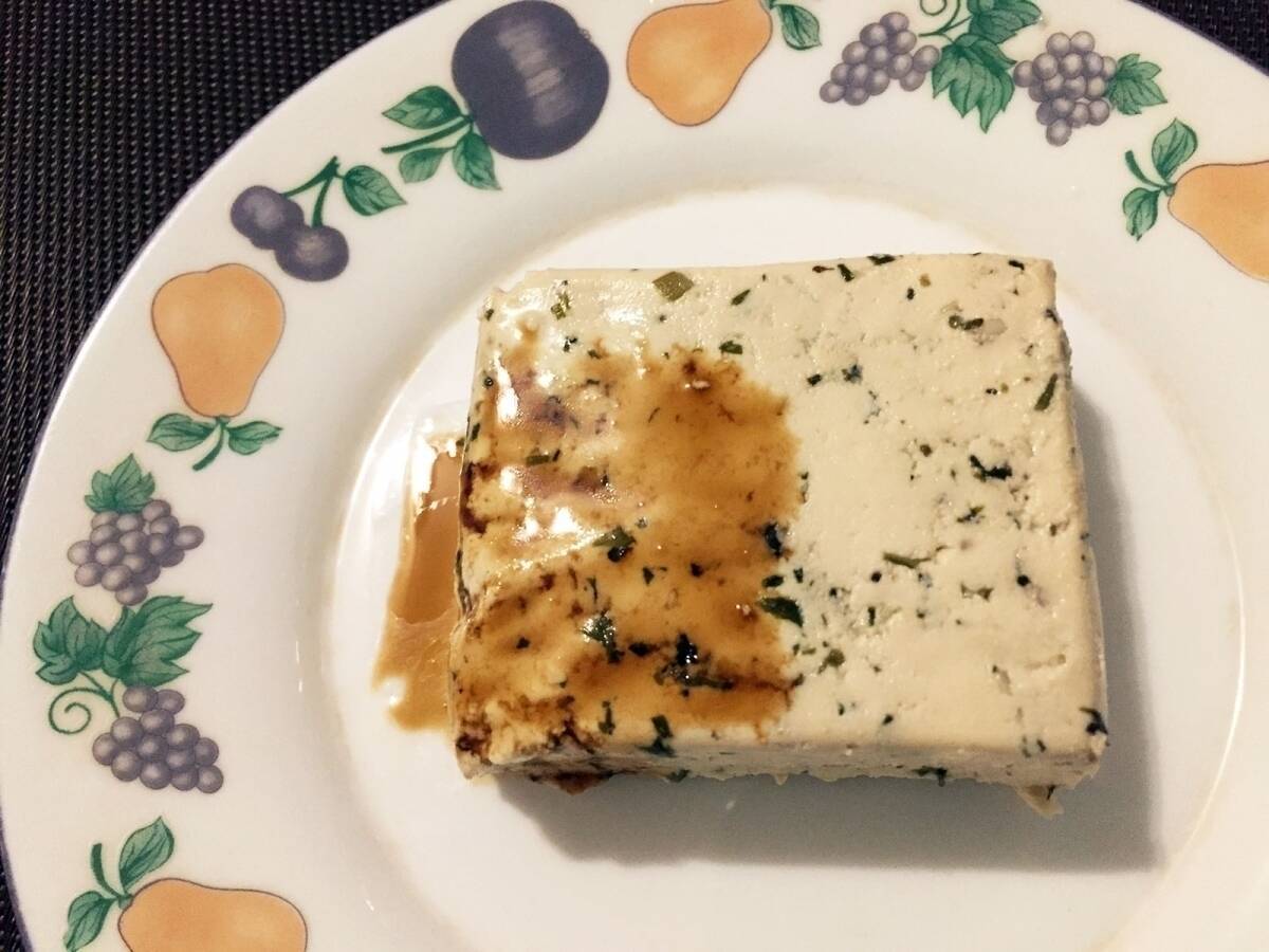 豆腐部分にガッツリとハーブが入っているためブルーチーズのようにも見えるが、においは紛れもなく豆腐。味はニンニクが入っているせいか、しっかりと風味があっておいしい。日本のデリケートな味わいの豆腐とは全く違うけど、別の食材として考えればかなりイケる。