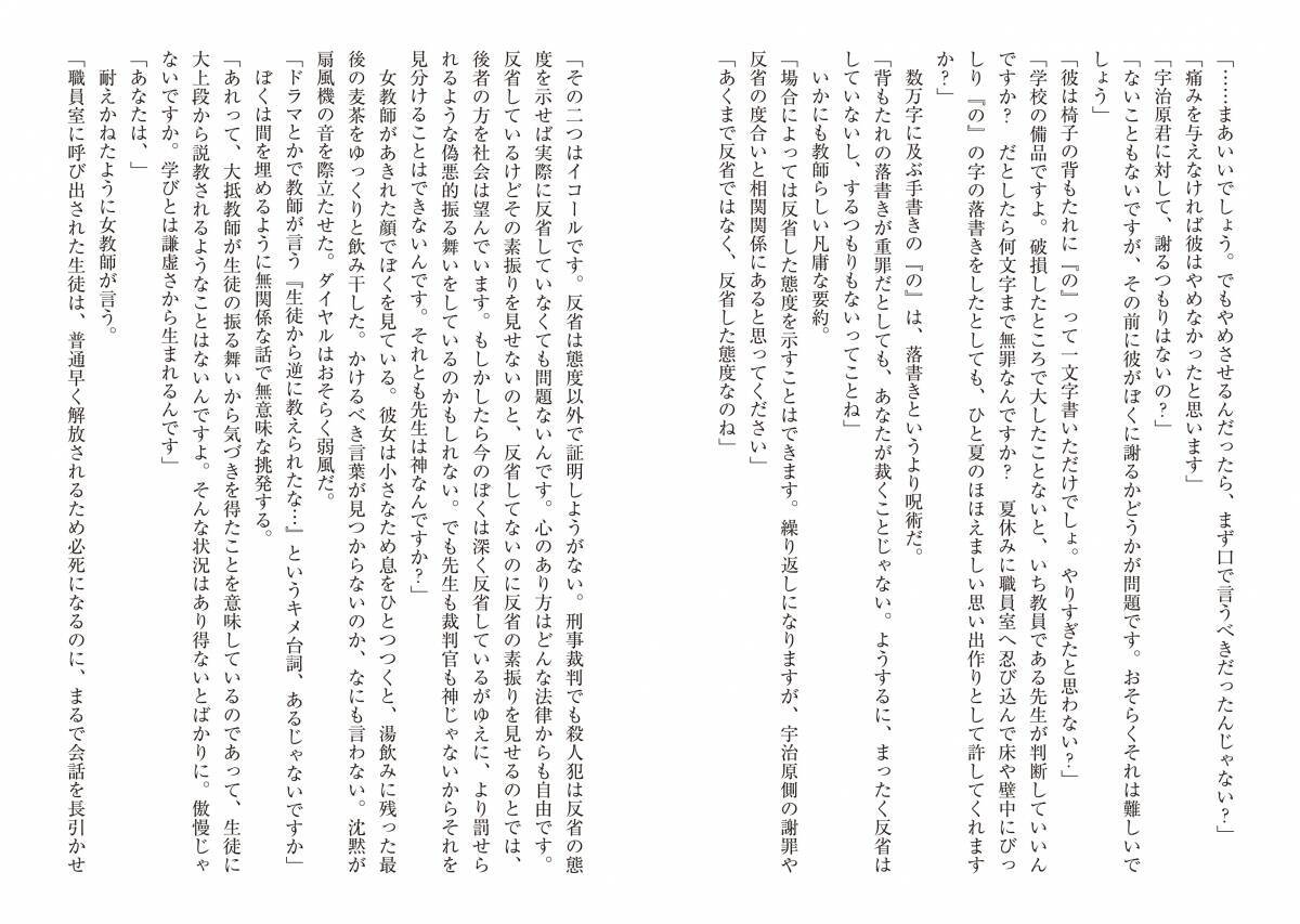 そういうキャラを描いていると正直、「そろそろ成熟した人間を描けよ!」という気持ちになるんですよね……。冒頭の教師に呼び出されるくだりは、ちょうど書いている時期に見た映画『海獣の子供』冒頭の職員室で叱られるシーンの影響です。実生活でもフィクションを見ていても、そういう場面に出くわすと頭の中で反抗したくなるんですよ。映画を見ながら、「冒頭はこういうやりとりにしよう」と考えていました。反抗と言っても「論破してスカッ!」というものではなく、煙に巻くようなのが好きなんです。今回の小説の主人公も屁理屈を言っているだけで、実際には全然やり込めていないですから。その後にもしっかり痛い目に遭いますし。
