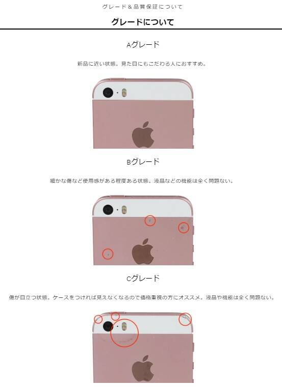 では、実際ににこスマで中古のiPhoneを購入する。まずはサイトで機種を選ぶわけだが、にこスマには「グレード」というものがある。「Aグレード」「Bグレード」「Cグレード」の3つに分類されており、Aに近づくにつれて状態のいい機器になる。